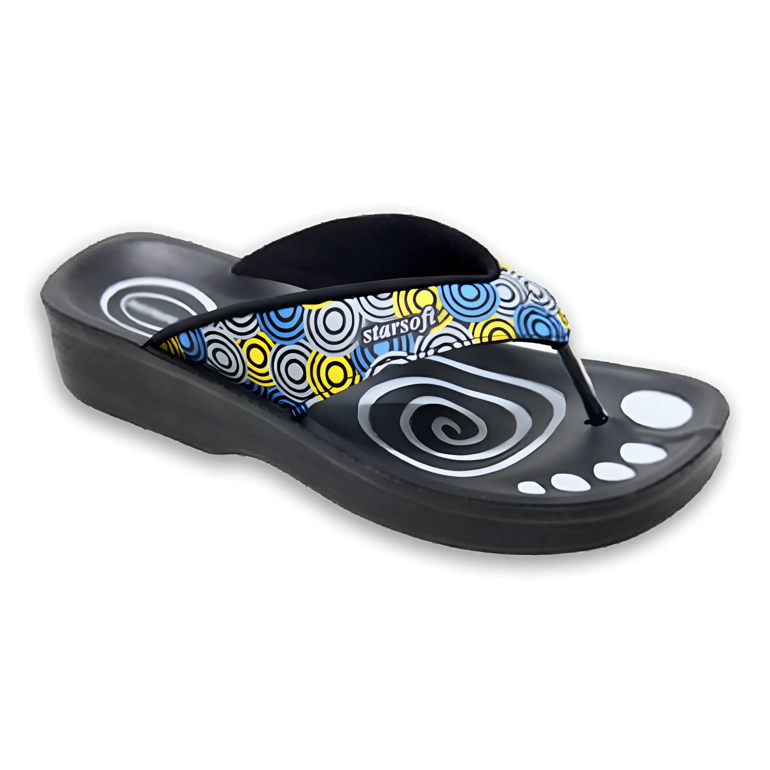 Stylish women’s wedge sandal with a modern printed strap and comfortable toe-post design. The cushioned sole and lightweight wedge heel provide all-day comfort, while the trendy circular pattern adds a fashionable touch. Perfect for casual outings and everyday wear.