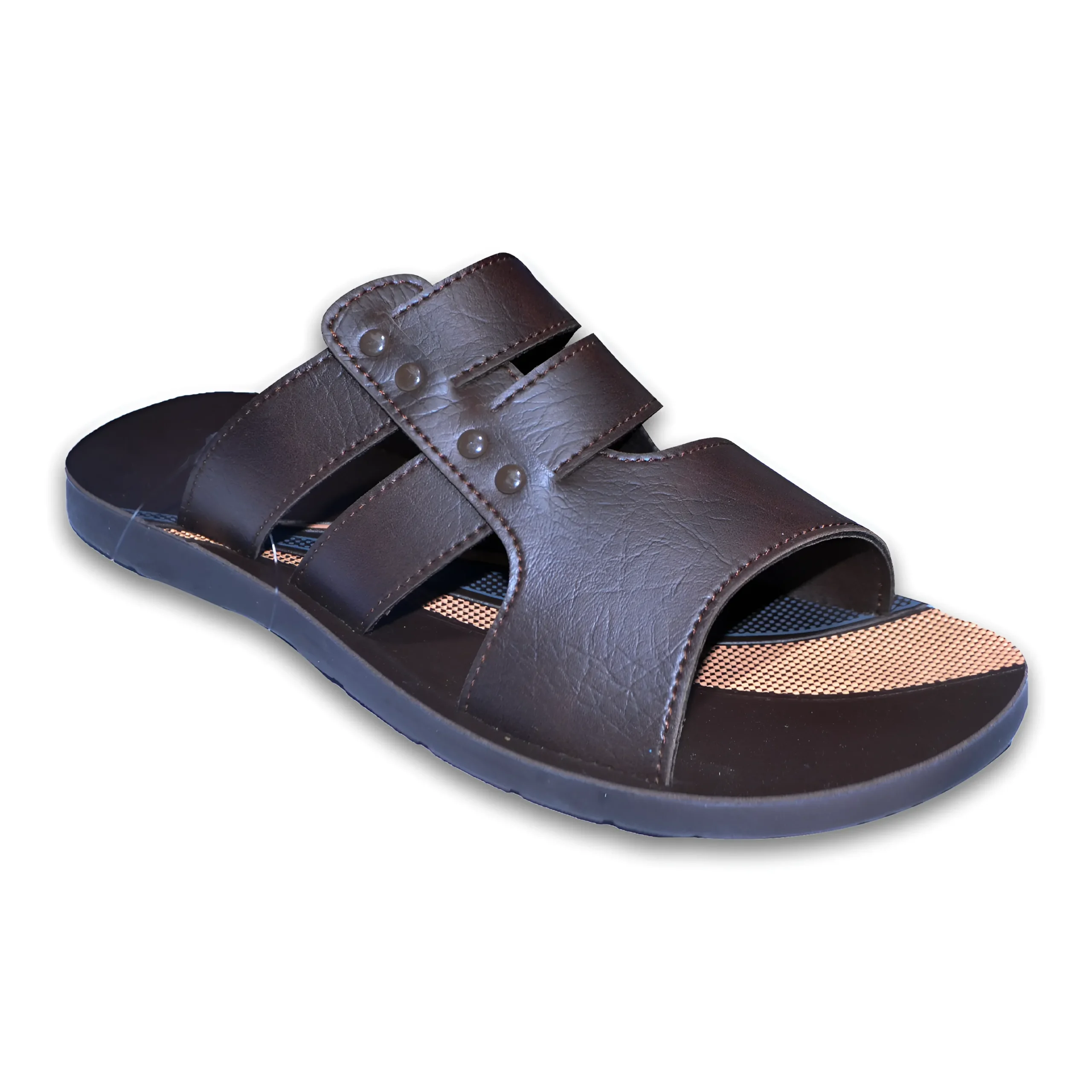 & Free ShippingTrendy men’s multi-strap slide sandal crafted from durable synthetic leather with a textured finish for a stylish look. Features overlapping straps with subtle metal stud detailing for added character and a secure fit. The soft cushioned footbed ensures everyday comfort, while the lightweight, anti-slip sole provides reliable grip—ideal for casual and daily wear.
