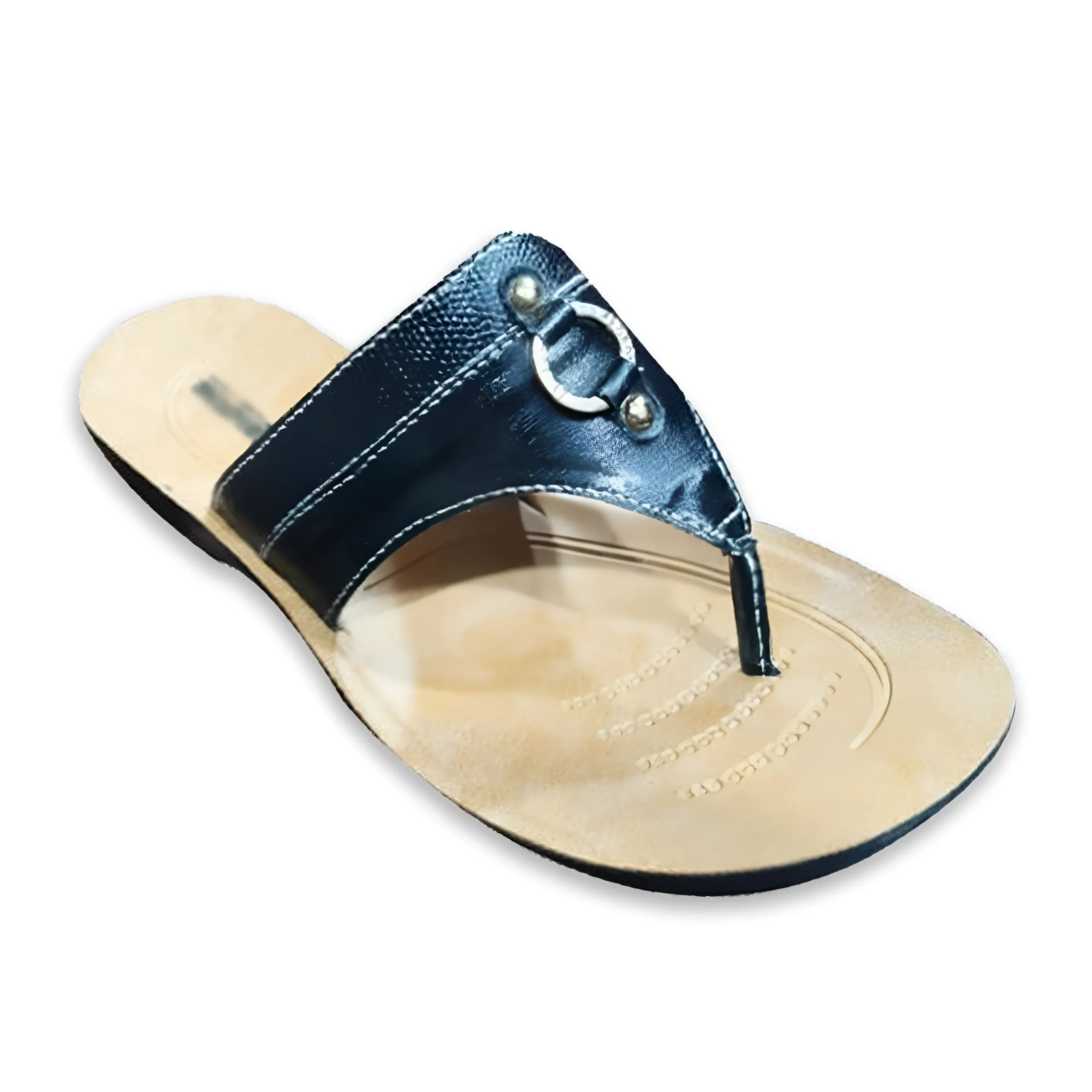 Chic black ladies slipper featuring a glossy strap with a decorative metal ring detail. Designed with a soft cushioned footbed and durable sole for comfortable everyday wear with a modern touch.