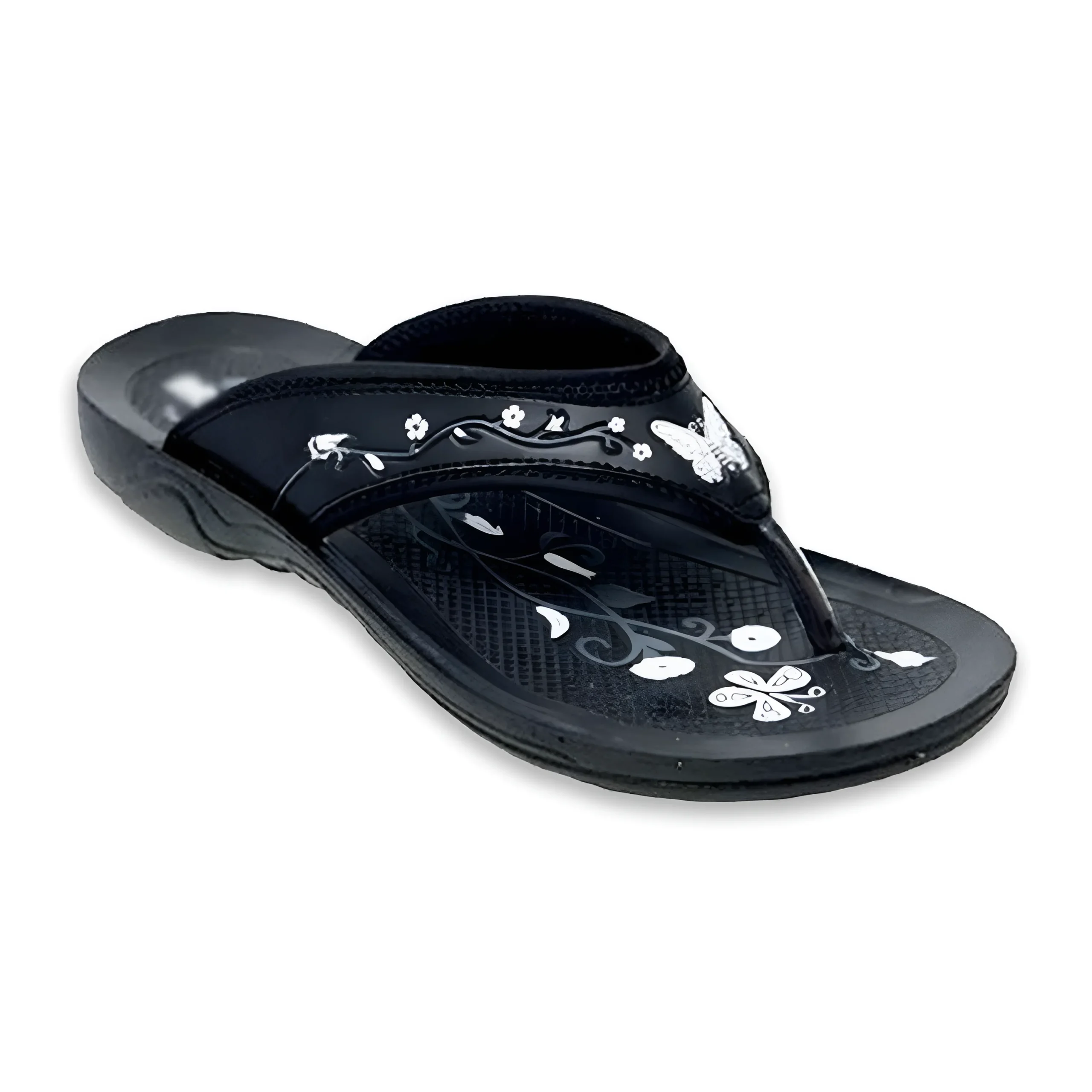& Free ShippingComfortable black ladies slipper featuring a stylish floral and butterfly print on the strap and footbed. Designed with a lightweight sole and soft base, making it perfect for daily casual wear with a simple and elegant look.